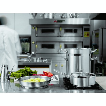 Ideali per ogni tipo di cottura: gas, elettrica, vetroceramica e anche induzione, grazie allo speciale fondo termodiffusore sandwich a tre strati (inox-alluminio-inox). La finitura interna ed esterna è satinata, mentre il bordo è lucido. Il bordo rinforzato e la manicatura tubolare in acciaio inox permettono di combinare ergonomia e resistenza al calore. Progettata per le esigenze degli chef professionisti e per il piacere dei gourmand più appassionati.