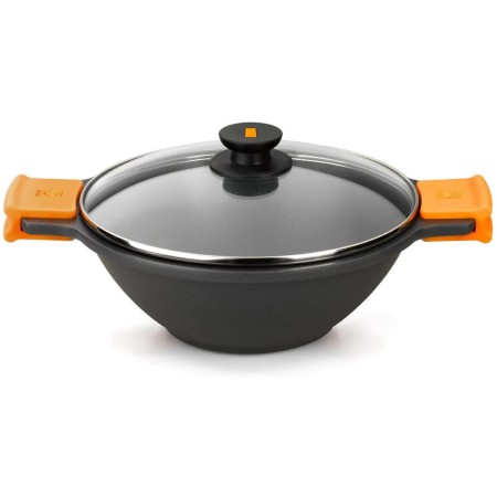 Wok 2 maniglie con coperchio in vetro e griglia serie efficient con presine in silicone orange.